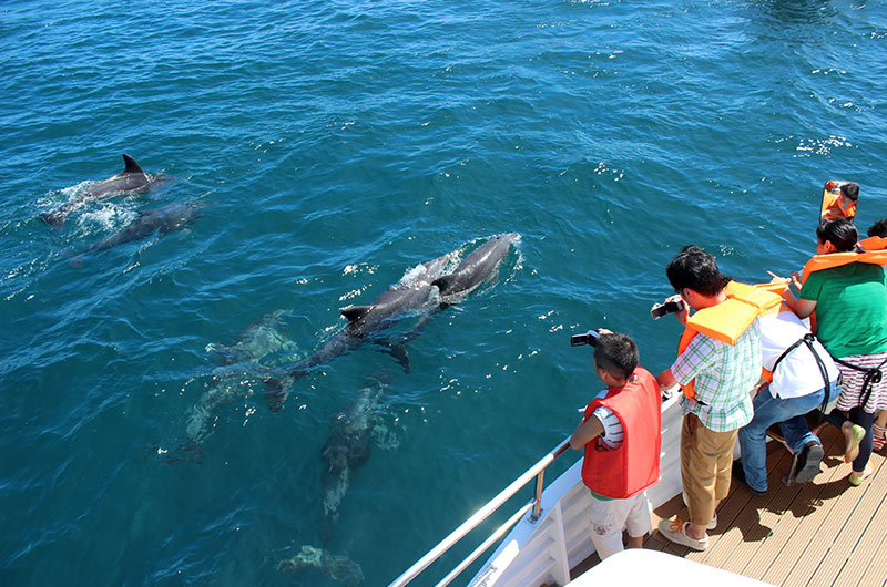 賞海豚行程中,全年都可與棲息在天草的野生瓶鼻海豚相遇。瓶鼻海豚非常親人,會與遊輪並排著游泳、在眼前跳躍,或銜著魚出現,讓我們看到各種表演。